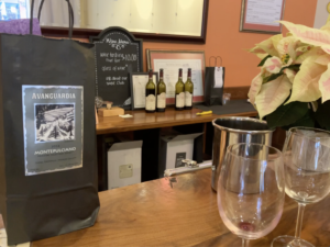 1. It’s a drizzly Saturday afternoon; mostly-local shoppers on the street. Way down at the end, next to the old movie theater is a small tasting room, easy to miss. The woman in the tasting room (the winemaker’s wife) was great! We had a good conversation about the vineyard, the wines, the wine business in general, and where the grapes originated.