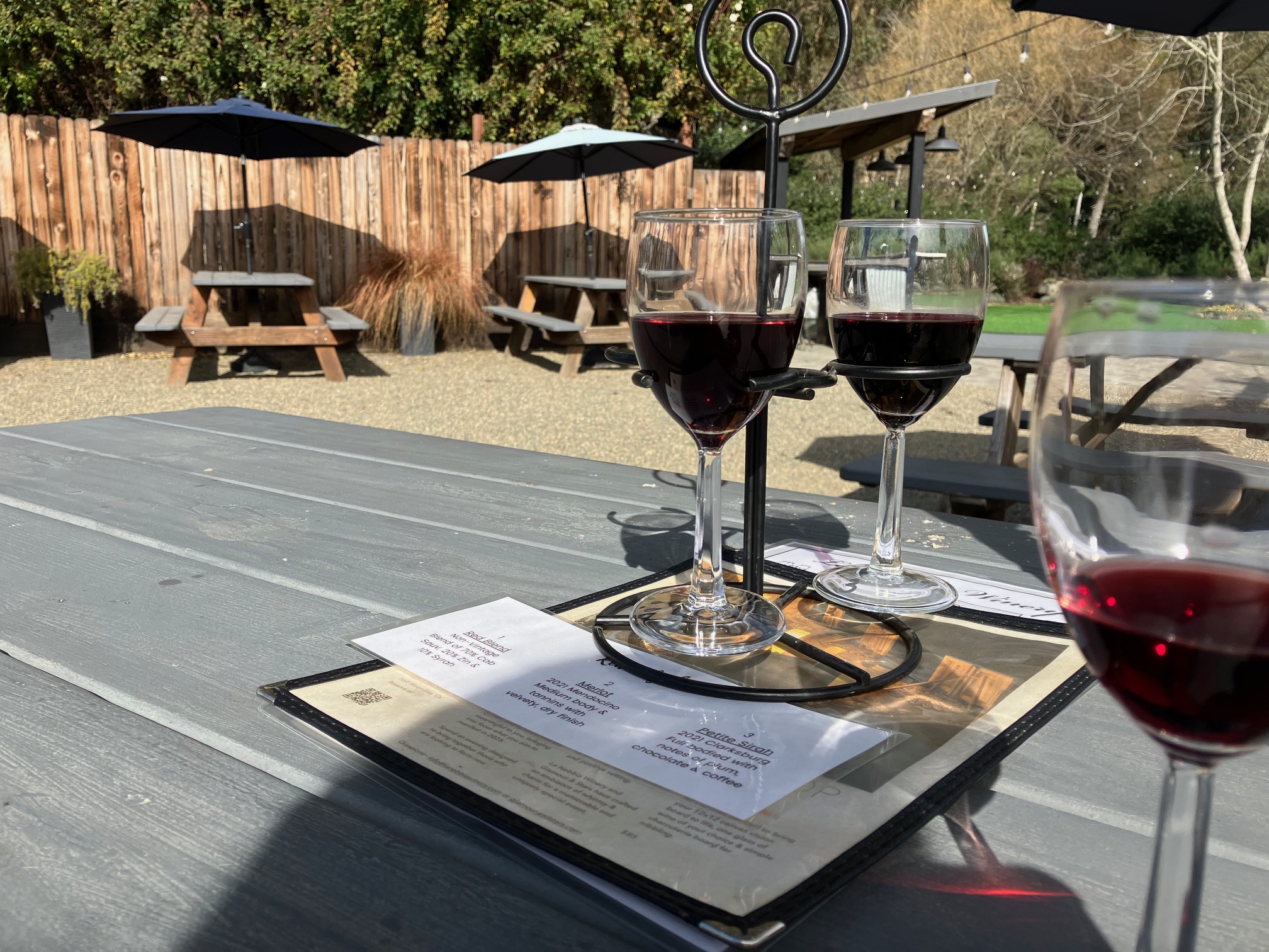 They offer two three-pour tastings, but the server was willing to swap selections between the two, if I wanted. I chose an all-red flight: a merlot, a red blend, and a petit verdot. All three were very respectable wines. This is a winery, not a vineyard—they source all of their grapes from growers in the north coast and Central Valley of California.
